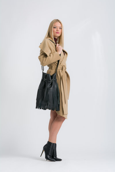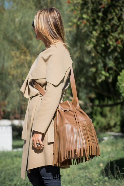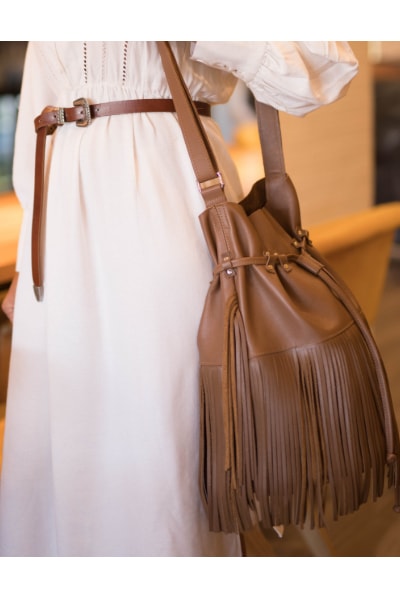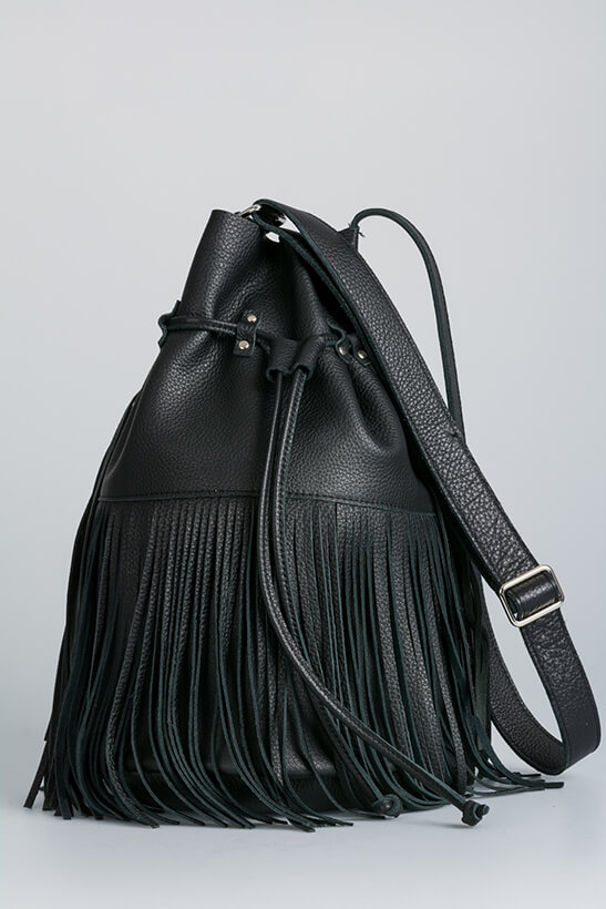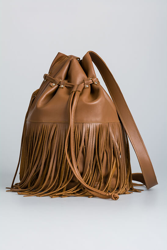 Χειροποίητη δερμάτινη τσάντα ώμου πουγκί από μαλακό δέρμα με κρόσσια.